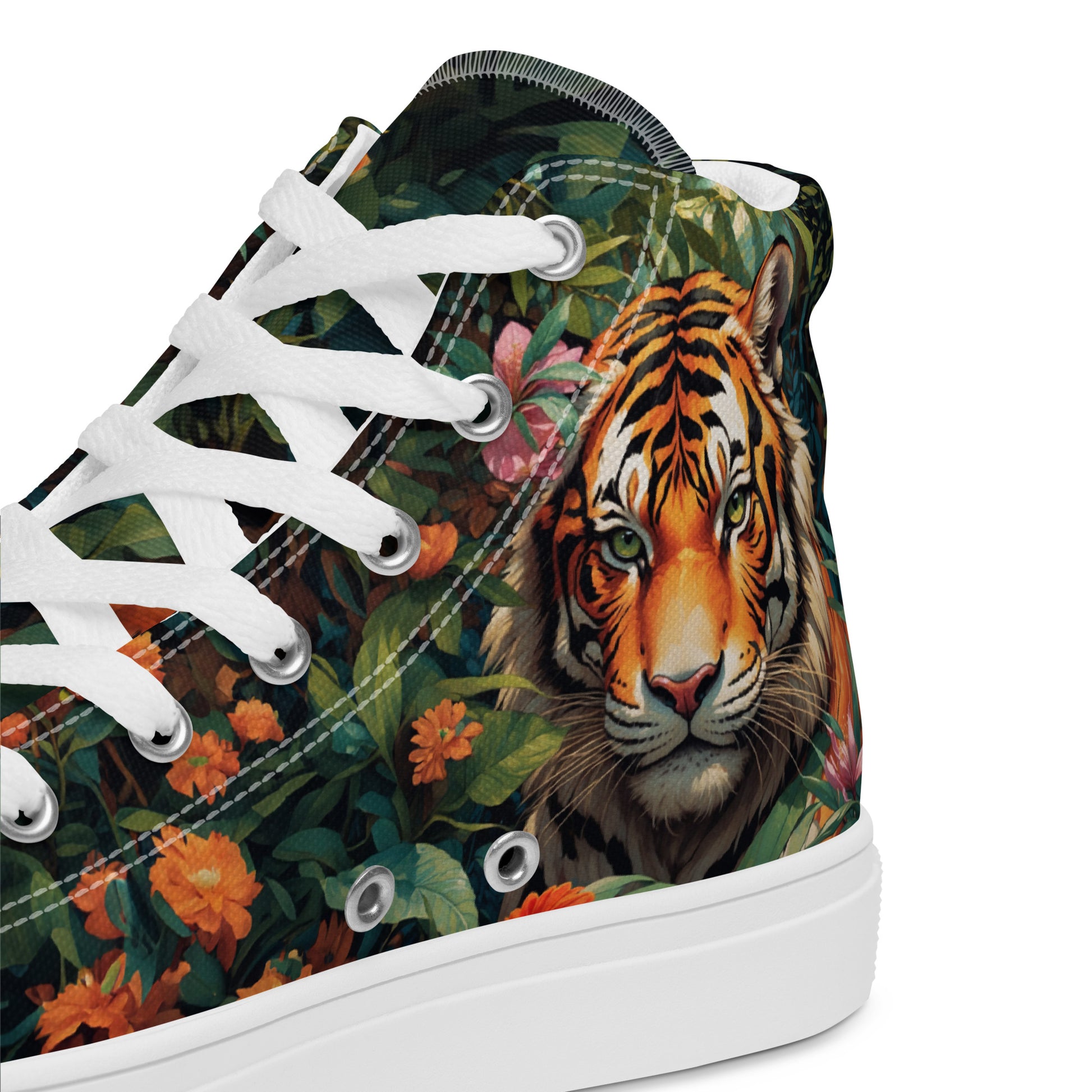 Step into the urban jungle with these captivating high-top canvas shoes, designed for those who dare to stand out. Featuring a breathtaking, detailed illustration of a majestic tiger amidst lush, vibrant foliage and exotic flowers, these unique sneakers are more than just footwear – they're a statement piece. Perfect for adding a touch of fierce street style and personality to any casual outfit, they blend eye-catching design with everyday comfort and durability.