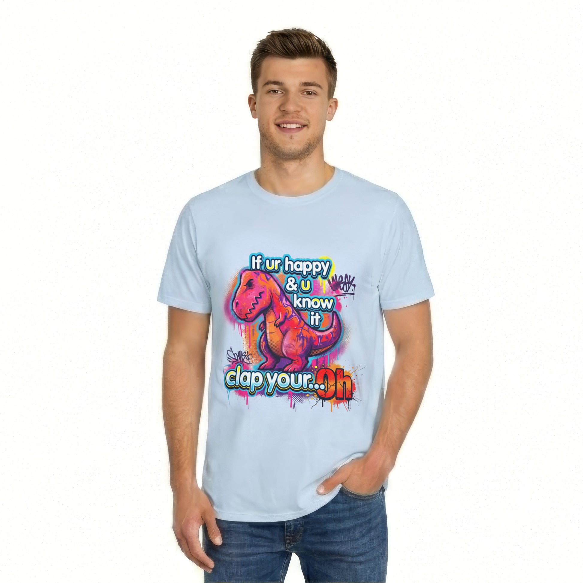 Bright, playful energy wrapped in a comfortable everyday tee. This lightweight cotton shirt carries a splashy graffiti-style T‑rex graphic and the cheeky line “If ur happy & u know it clap your... uh” — a wink of humor that reads like street art. The print’s neon tones pop against the soft, smooth fabric, creating a casual look that feels intentionally fun and slightly rebellious. Wear it for weekend hangs, skatepark laps, or lazy coffee runs; it sits easy under a jacket or pairs with lived-in jeans. The shirt breathes, moves with you, and keeps that colorful design front-and-center without weighing you down.