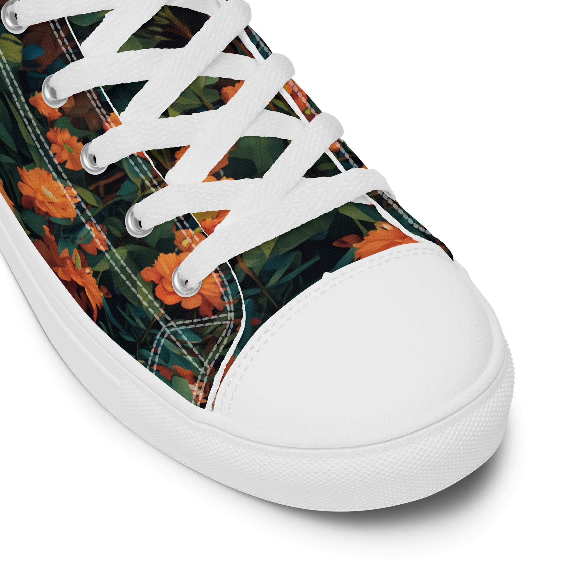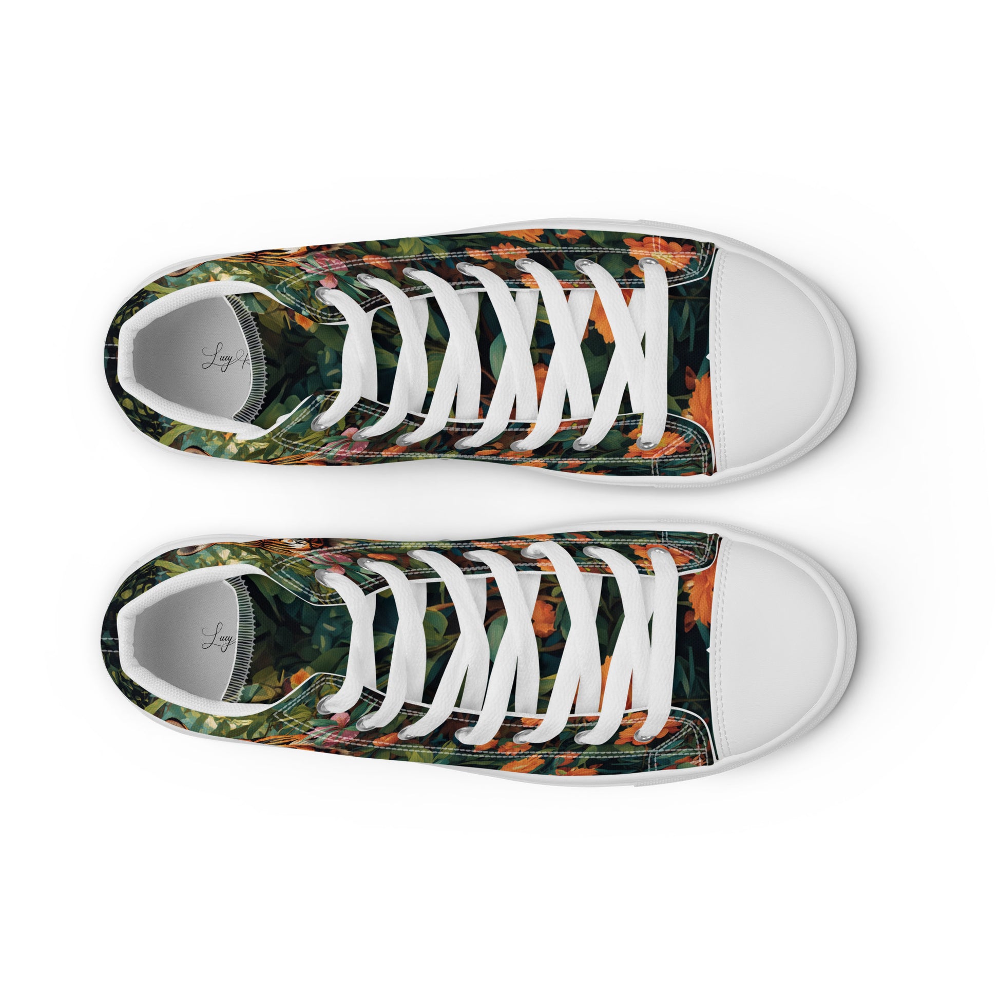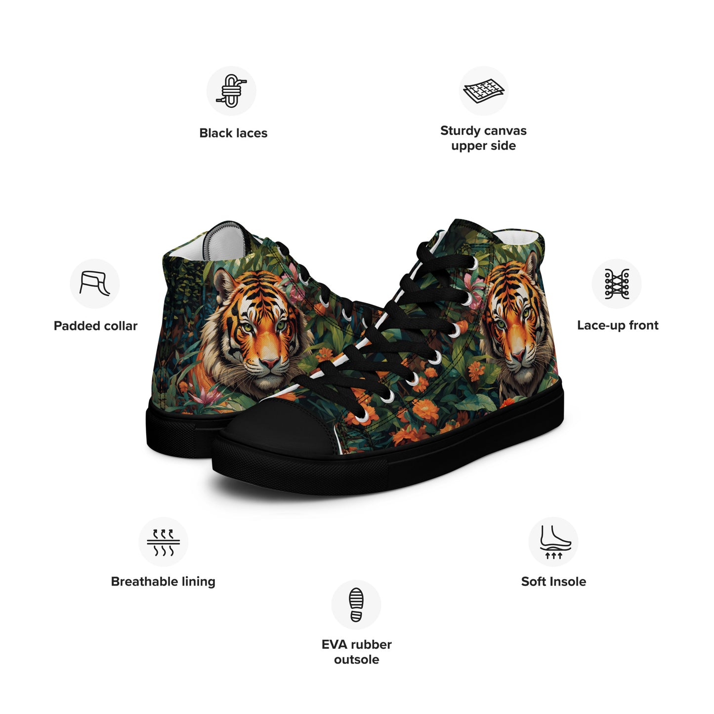 Step into the urban jungle with these captivating high-top canvas shoes, designed for those who dare to stand out. Featuring a breathtaking, detailed illustration of a majestic tiger amidst lush, vibrant foliage and exotic flowers, these unique sneakers are more than just footwear – they're a statement piece. Perfect for adding a touch of fierce street style and personality to any casual outfit, they blend eye-catching design with everyday comfort and durability.