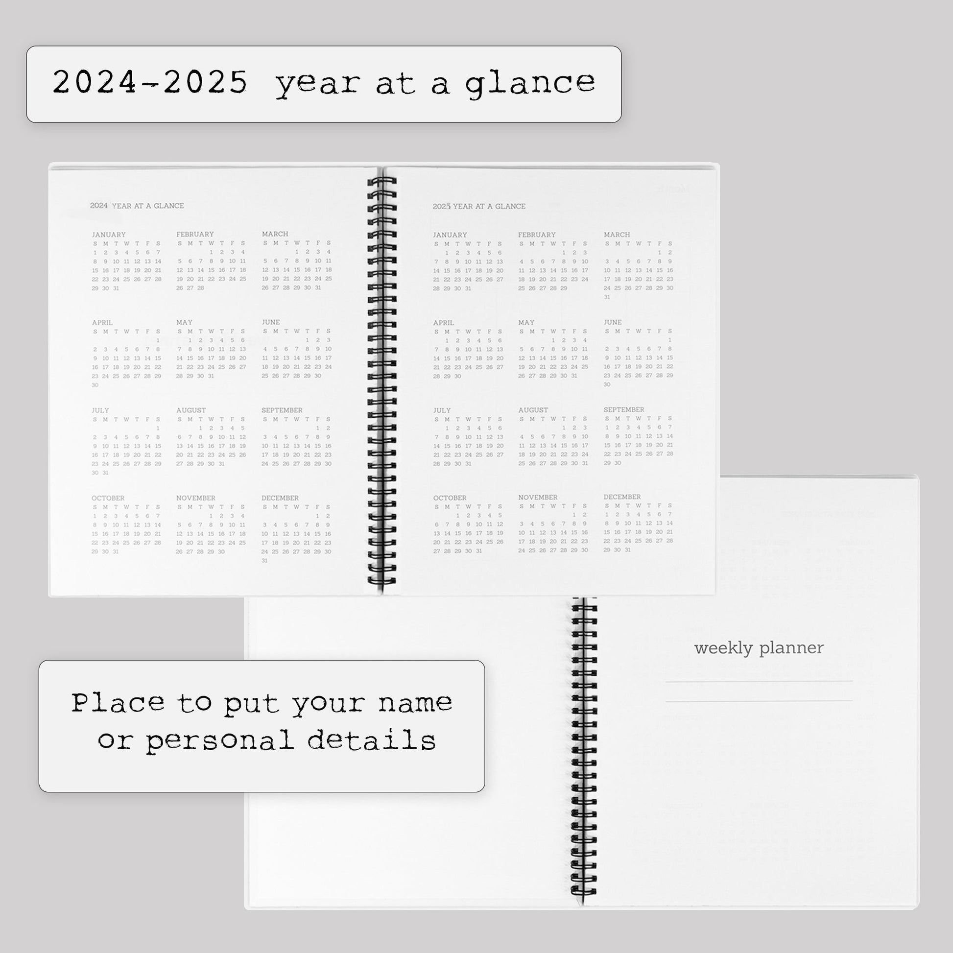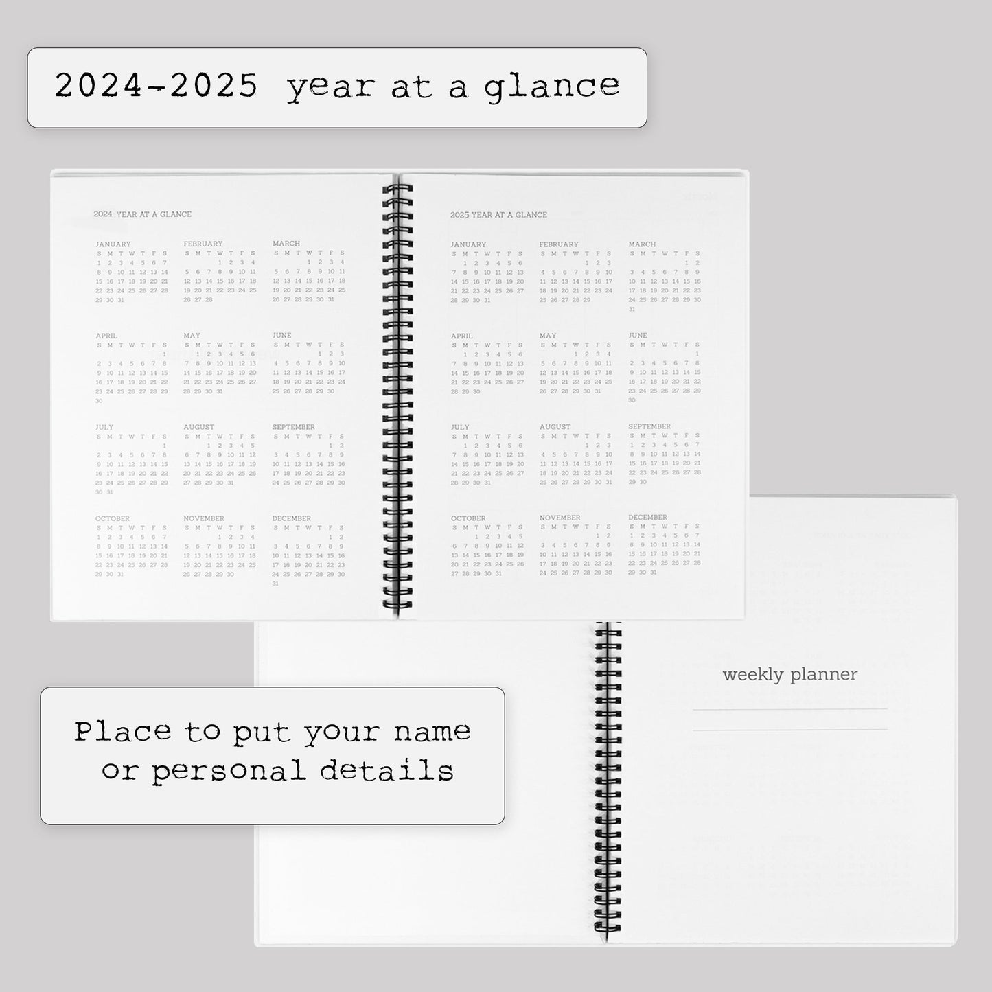 Start planning anytime – no wasted pages! Includes undated monthly/weekly layouts, a 2024-2025 Year-at-a-Glance, and dedicated note pages for brainstorming, gratitude, or big ideas.