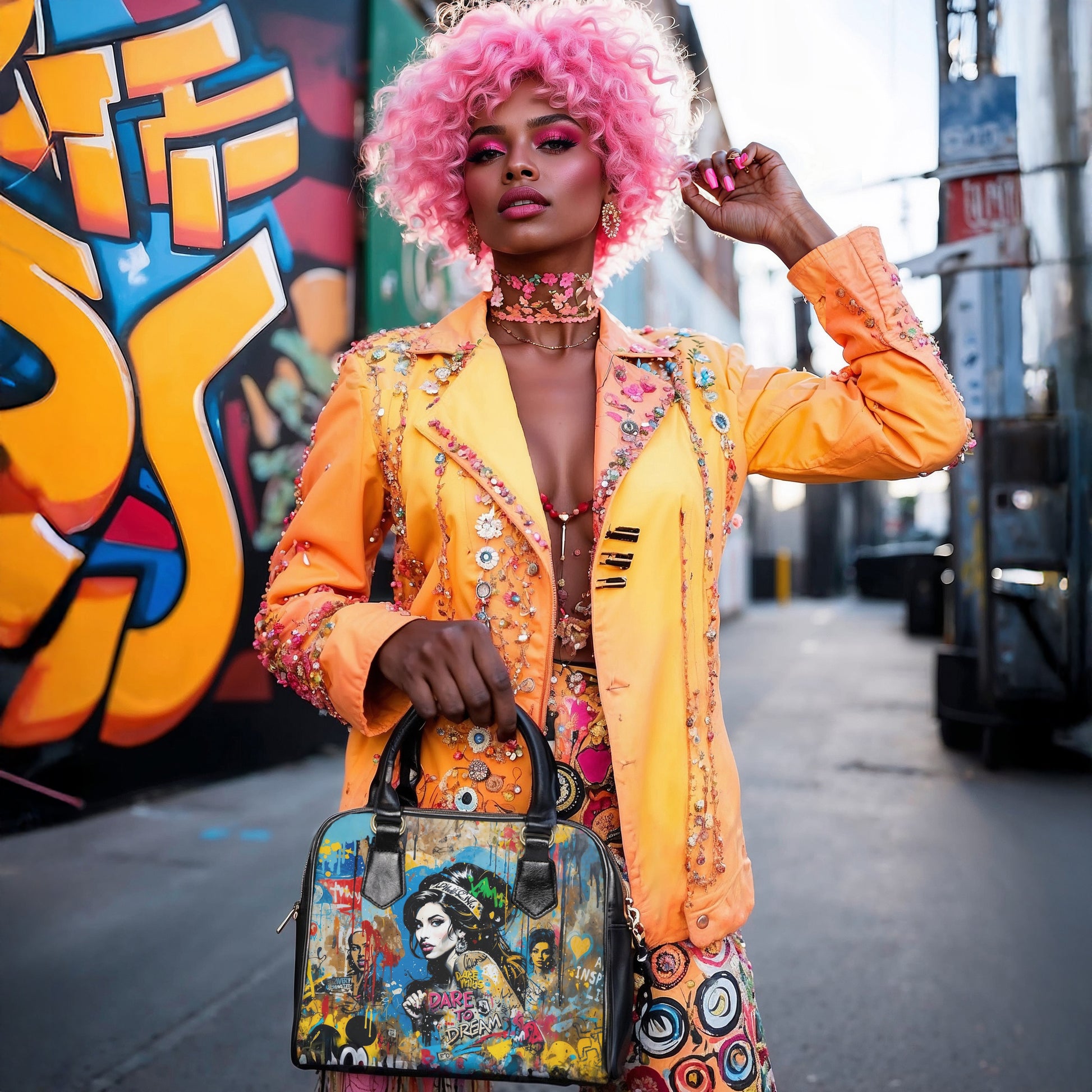 This handbag features an illustration of Amy Winehouse in a graffiti street art style, giving off a cool and edgy vibe. Perfect for music lovers and fans of urban art, this handbag is a unique statement piece that adds a pop of color to any outfit. Ideal for everyday use or special occasions, this handbag is a must-have for those who appreciate bold and artistic accessories.
